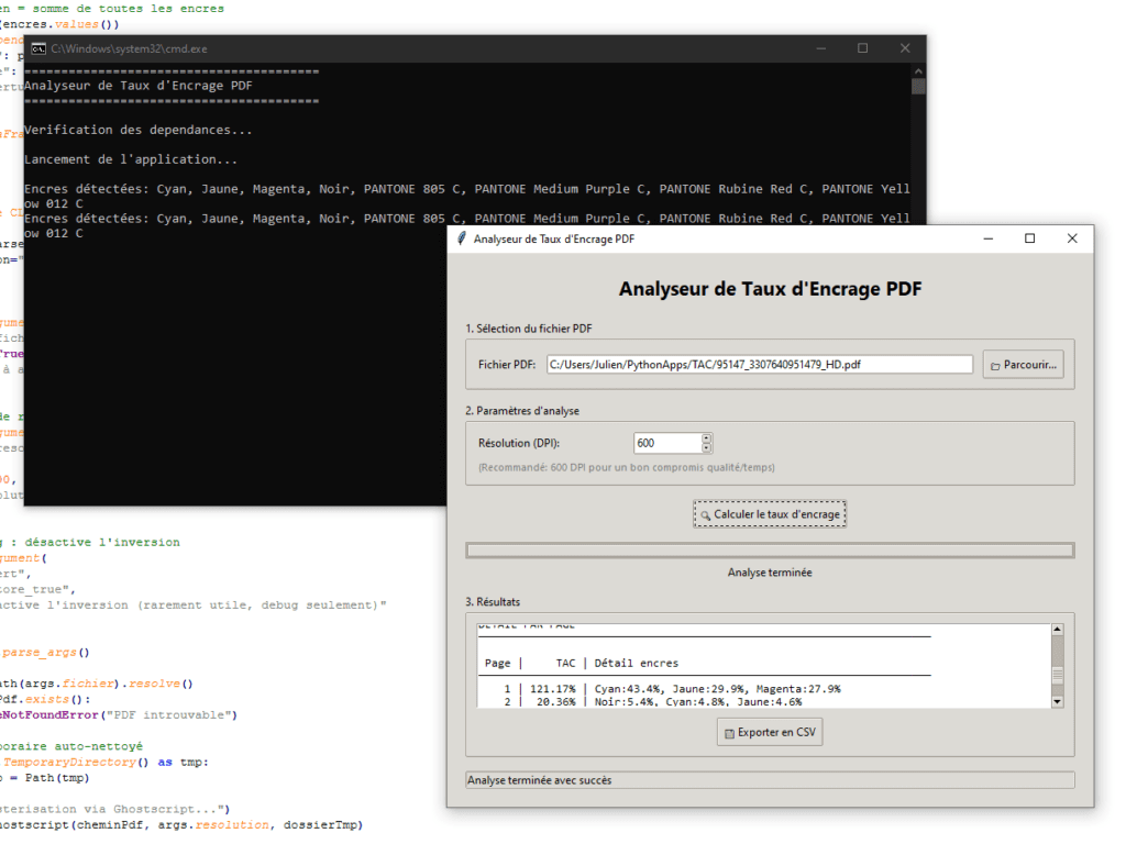Il sert ici de “colle” entre les différents outils : orchestration de Ghostscript, lecture des images, calcul des indicateurs, et export des résultats sous forme de tableau (CSV). L’intérêt principal est la reproductibilité : une fois le script validé, l’analyse peut être rejouée à l’identique sur n’importe quel document.