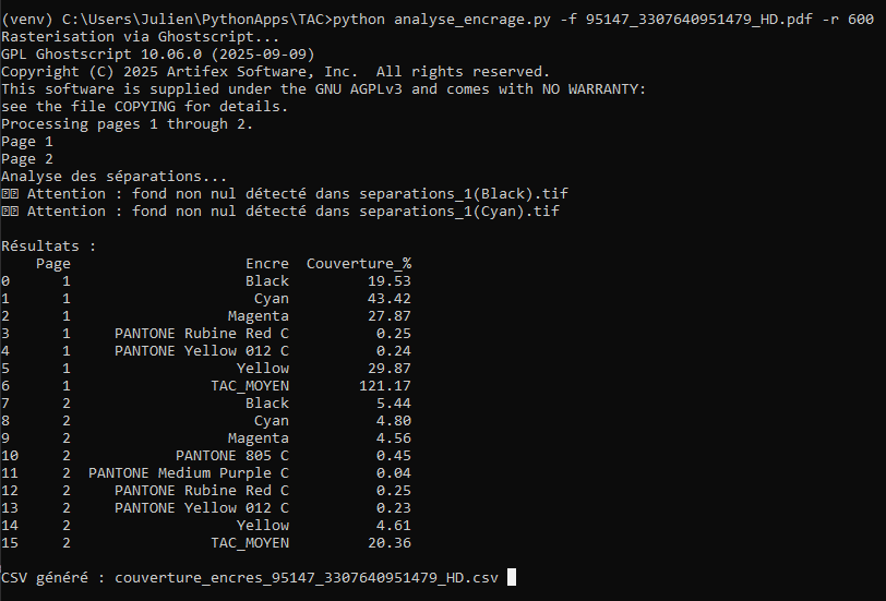 Dans ce projet, il est utilisé comme un véritable moteur de prépresse : il transforme un PDF en séparations couleur en ton continu (une image par encre, sans tramage). C’est cette étape qui permet de passer d’un document vectoriel abstrait à des données mesurables, exploitables pour un calcul objectif du taux d’encrage.